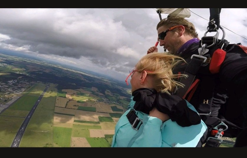 Parachuting… Mein erster Fallschirmsprung, ein paar Stunden vorher noch für unmöglich gehalten, weil das Wetter nicht mitspielen wollte. Aber dann.. siehe oben. Was ich seitdem über mich weiß: Ich bin kein Angsthase. Und: Das nächste Mal trage ich eine Sturmhaube, damit die Ohren schön warm bleiben 😉