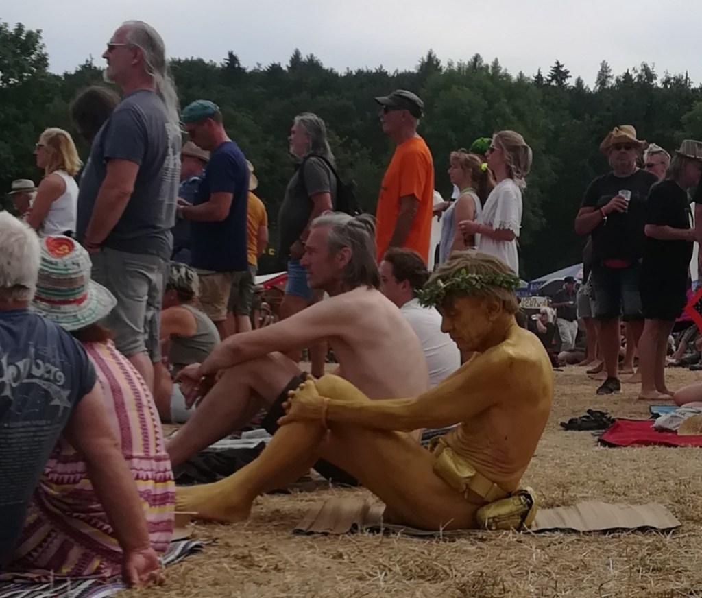 Ein paar Kilometer vor der Einfahrt aufs Festivalgelände bekommt Mama mein obligatorisches „Bin heil angekommen, liebe Grüße!“, danach sind wir erstmal mit Zeltaufbau und Dixie-Klo-Begutachtung beschäftigt. Anderthalb Kilometer vom Zelt bis zur Freak-Area, und los geht‘s mit Snapshots: Eine bunt gemusterte Ansammlung von Menschen zwischen eins und mindestens 91 (!) bewegt sich über die Wiesen, viele mit Dreadlocks und angezogen mit Tattoos, eine Unmenge junger Männer mit Haremshosen, alt und speckig oder frisch erstanden in einer der vielen Alternativ-Bedarfshops rund um die Konzertplätze. Das Wetter ist genau richtig – trocken und nicht zu heiß, nicht zu kühl – und schon bald erspäht der Cousin den „Goldmann“, der offenbar auf keinem Herzberg-Festival fehlt.